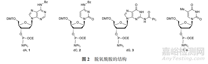 固相合成通過樹脂的5′-OH與下一個(gè)核苷酸的磷酰胺反應(yīng)生成磷酸二酯鍵,因此脫氧核苷亞磷酰胺(結(jié)構(gòu)式見圖2)需要保護(hù)5′-OH(通常用三苯甲基DMT保護(hù))、磷羥基(通常用氰乙基CE保護(hù))、堿基上的伯氨(通常用酰基保護(hù))。