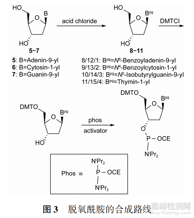 脫氧酰胺以發(fā)酵來源的天然脫氧核苷為起始物料(合成路線示例見圖3),先對(duì)堿基上的伯氨基進(jìn)行保護(hù)(由于胸腺嘧啶無伯氨基無需進(jìn)行保護(hù)),然后5′-OH經(jīng)DMT保護(hù),再與磷試劑制備得到。