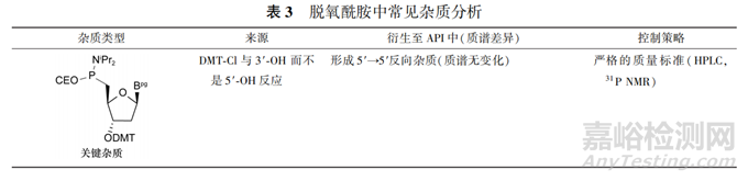 脫氧酰胺中常見雜質(zhì)見表3,關(guān)鍵雜質(zhì)(同時(shí)含有磷酰胺基團(tuán)和DMT保護(hù)基團(tuán))為3′和5′-OH保護(hù)基相反的雜質(zhì)以及堿基未被保護(hù)的雜質(zhì),可以通過嚴(yán)格的脫氧酰胺質(zhì)量標(biāo)準(zhǔn)進(jìn)行控制。脫氧酰胺的質(zhì)量標(biāo)準(zhǔn)側(cè)重于控制關(guān)鍵雜質(zhì)和整體純度,可以采用HPLC法以及31P NMR法檢測(cè)雜質(zhì)和純度水平。