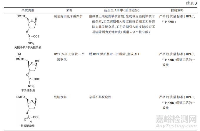 2′修飾酰胺中關(guān)鍵雜質(zhì)見表4。關(guān)鍵雜質(zhì)(同時(shí)含有磷酰胺基團(tuán)和DMT保護(hù)基團(tuán))除了與脫氧酰胺類似的3′和5′-OH保護(hù)基相反的雜質(zhì)和堿基未被保護(hù)的雜質(zhì)外,還包括2′-O烷基修飾的雜質(zhì)、2′和5′-OH保護(hù)基相反的雜質(zhì),可以通過嚴(yán)格的脫氧酰胺質(zhì)量標(biāo)準(zhǔn)進(jìn)行控制。脫氧酰胺的質(zhì)量標(biāo)準(zhǔn)側(cè)重于控制關(guān)鍵雜質(zhì)和整體純度,可以采用HPLC法(HPLC-UV,HPLC-MS)以及31P NMR來檢測(cè)雜質(zhì)和純度水平。