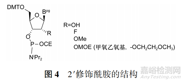 對(duì)于2′修飾(-OMe、-F、-OMOE)的核苷亞磷酰胺(結(jié)構(gòu)見圖4)
