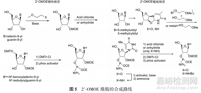 以天然核糖核苷為起始物料,可通過對(duì)2′OH進(jìn)行修飾(修飾后的2′位為惰性反應(yīng)位點(diǎn),不再參與反應(yīng)),后續(xù)的上DMT保護(hù)基及合成亞磷酰胺步驟與前述脫氧核苷相同。常見的2′-OMOE核苷亞磷酰胺的合成路線見圖5。