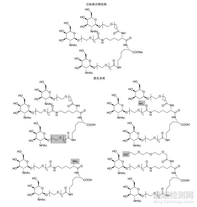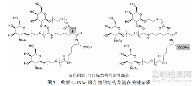 具有雙賴氨酸部分的典型GalNAc綴合物結(jié)構(gòu)見圖7。通過天然糖和氨基酸反應(yīng)制備得到單一立體異構(gòu)體結(jié)構(gòu),其存在的潛在雜質(zhì)包括乳糖胺脫乙?;s質(zhì)等。目前,GalNAc綴合物在商業(yè)環(huán)境中的應(yīng)用是一個(gè)非常不成熟的領(lǐng)域,應(yīng)根據(jù)綴合物的合成工藝及結(jié)構(gòu)特點(diǎn)進(jìn)行工藝雜質(zhì)和降解雜質(zhì)的分析。