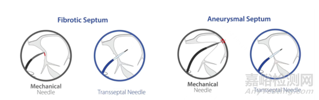相較于目前的機(jī)械穿刺,射頻房間隔穿刺針的優(yōu)勢在于并不單純依靠機(jī)械推力,而是通過射頻能量輔助醫(yī)生穿過中隔區(qū),減少患者因彈性、瘤性、纖維化程度等原因?qū)е轮懈舸┩鸽y的醫(yī)源性損傷,大幅降低由于過度突破和誤穿左心房壁后部的風(fēng)險(xiǎn)。