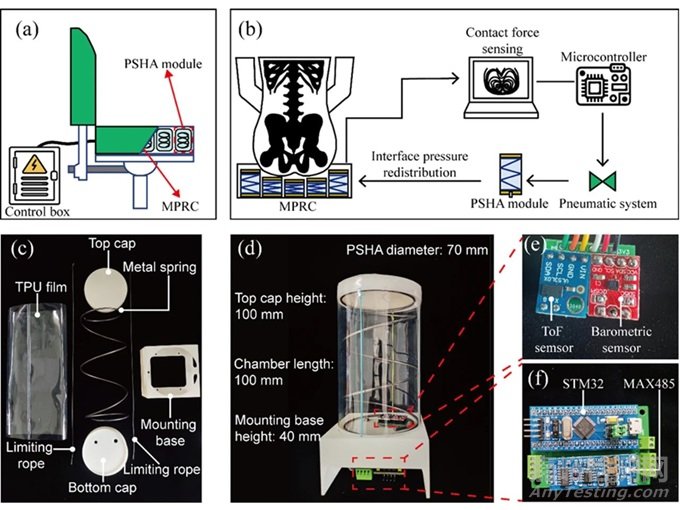 圖1:a) 模塊化壓力再分配墊 (MPRC) 的結(jié)構(gòu) b) MPRC和壓力再分配過程的示意圖 c) 本體感覺軟剛混合執(zhí)行器(PSHA)模塊的制造和組裝工藝 d) 制造PSHA模塊 e) 測距傳感器和氣壓傳感器 f) 控制板(圖片來自原文)