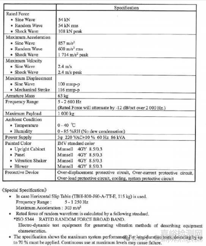 其他一些說明相對來說不是很重要了,比如說設(shè)備的顏色號碼、最大載重質(zhì)量、使用環(huán)境、電力供應(yīng)要求、回路保護(hù);還有就是關(guān)于隨機(jī)試驗(yàn)是按照ISO 5344的頻率帶寬來進(jìn)行計算的;最后建議為了延長設(shè)備的使用壽命,盡量不要靠近滿載下運(yùn)行,建議在最大推力的70%下運(yùn)行設(shè)備。