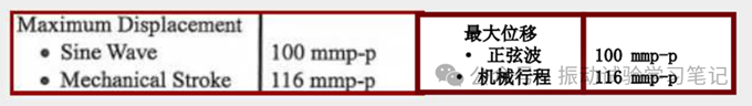 振動試驗(yàn)機(jī)可對應(yīng)的最大位移。在動圈到達(dá)機(jī)械行程前,若達(dá)到正弦波最大位移,將產(chǎn)生過位移報警。也有可能大位移試驗(yàn)條件時,即使沒有達(dá)到正弦波最大位移,由于空氣支撐彈簧的運(yùn)動,振動臺本體運(yùn)動加上動圈運(yùn)動,也會產(chǎn)生過位移報警,所以需要注意式樣規(guī)格表下面的注釋。如,由于防振部件的共振影響,10Hz以下頻率時,最大位移實(shí)現(xiàn)比較困難,需要鎖住振動臺來執(zhí)行大位移試驗(yàn)。