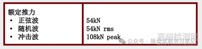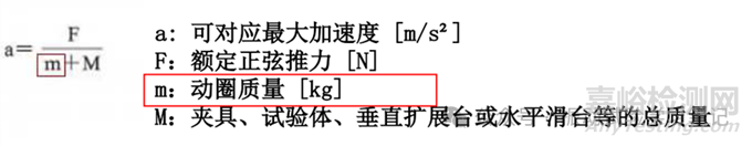 額定推力是指振動試驗(yàn)機(jī)可以產(chǎn)生的最大推力。可通過它,針對某一試驗(yàn)體(質(zhì)量體)簡單的計算出可對應(yīng)的加速度值。注意單位為[kN],下面計算式中為[N]。當(dāng)試驗(yàn)夾具和試驗(yàn)體對試驗(yàn)有比較大的影響情況(共振和反共振等因素)下,該計算不能保證試驗(yàn)成功。