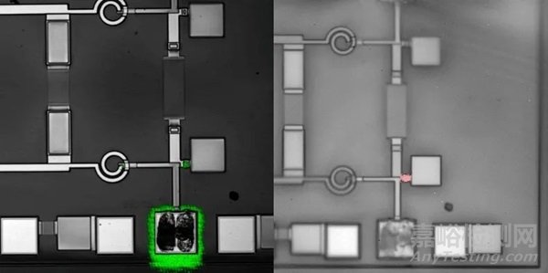 圖3 樣品OBIRCH(左)與鎖相紅外熱成像(右)