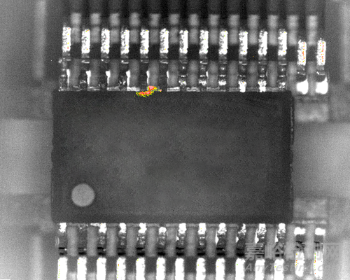 某芯片經(jīng)高溫蒸煮可靠性試驗后在功能測試時端口漏電流超標(biāo),需要對漏電通道進(jìn)行定位。將樣品進(jìn)行功能鎖相紅外熱成像測試,經(jīng)觀察發(fā)現(xiàn):加電條件下該端口與相鄰端口引腳間存在熱點,漏電流大小為25µA。熱點定位結(jié)果如圖5所示。