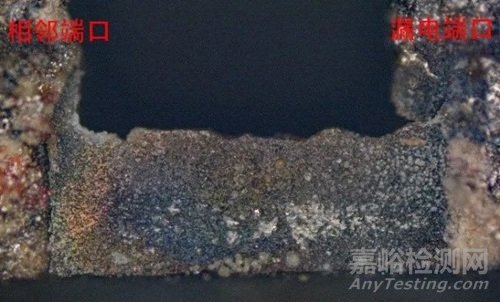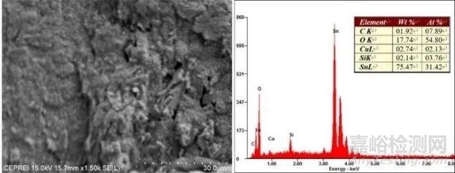 對定位結(jié)果進(jìn)行成分檢查發(fā)現(xiàn):紅外熱點位置存在Sn元素。端口間金相及EDS能譜圖如圖6、7所示。