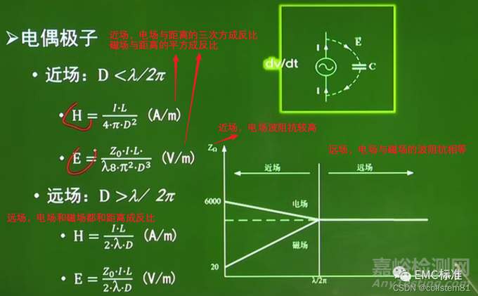 1、如果騷擾源是高電壓,小電流的源,則近場只要是電場。如下圖所示偶極子天線模型,天線兩極間有一定電壓但電流較小,主要是空間的位移電流。則在偶極子天線附近,電場大于磁場。