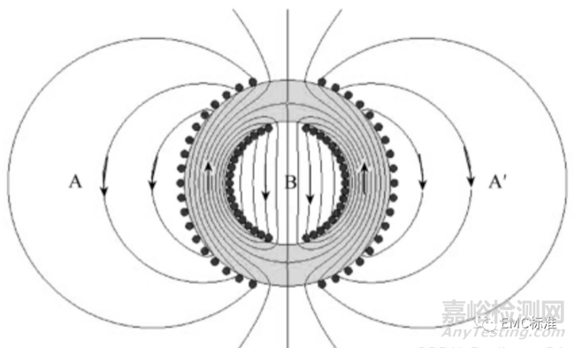 以共模電感為例,其周圍的電磁場泄露見下圖,可見要避免在其上下兩繞組開口處放置敏感器件,此兩處漏磁場密度最高,強度最大。