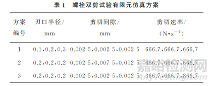 由于螺栓雙剪試驗(yàn)裝置存在制造和測(cè)量誤差,試驗(yàn)結(jié)果可能會(huì)受到不同程度的影響。影響試驗(yàn)結(jié)果的因素主要包括:剪切裝置的圓角半徑、剪切載荷施加的速 率(剪切速率)、上下剪刀的間隙(剪切間隙)等。雙剪試驗(yàn)標(biāo)準(zhǔn)中對(duì)上述因素進(jìn)行了數(shù)值范圍上的約束,但不同因素對(duì)雙剪試驗(yàn)結(jié)果的影響程度不同。利用有限元分析方法,對(duì)剪刀圓角半徑、剪切速率以及剪切間隙等因素進(jìn)行建模仿真,并與理想條件(無(wú)圓角、無(wú)間隙、剪切速率為666.7N/s)進(jìn)行對(duì)比,分析不同因素對(duì)螺栓雙剪試驗(yàn)結(jié)果的影響。