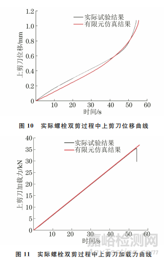 為了驗(yàn)證實(shí)際試驗(yàn)結(jié)果與有限元仿真結(jié)果的吻合度,開展了實(shí)際螺栓雙剪試驗(yàn),并將實(shí)際試驗(yàn)結(jié)果與理想條件下螺栓雙剪試驗(yàn)的有限元仿真結(jié)果進(jìn)行對(duì)比,實(shí)際螺栓雙剪過程中上剪刀位移曲線及上剪刀加載力曲線分別如圖10,11所示。由圖10,11可知:實(shí)際試驗(yàn)結(jié)果與有限元仿真結(jié)果吻合較好,說明有限元仿真結(jié)果具有較高的準(zhǔn)確性。