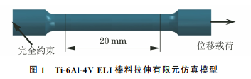 螺栓和螺母的材料為Ti-6Al-4V ELI鈦合金。為確保有限元模型中材料參數(shù)的準(zhǔn)確性,首先參考GB/T 228.1—2021《金屬材料 拉伸試驗(yàn) 第1部分:室溫試驗(yàn)方法》,對(duì)Ti-6Al-4V ELI鈦合金材料進(jìn)行準(zhǔn)靜態(tài)棒料拉伸試驗(yàn),以獲得材料的名義應(yīng)力-名義應(yīng)變曲線;然后進(jìn)行計(jì)算,將名義應(yīng)力-名義應(yīng)變曲線轉(zhuǎn)化為真實(shí)應(yīng)力-真實(shí)應(yīng)變曲線,得到材料的彈性和塑性參數(shù);根據(jù)得到的材料參數(shù),建立Ti-6Al-4V ELI棒料拉伸有限元仿真模型,以驗(yàn)證材料參數(shù)的準(zhǔn)確性。棒料拉伸有限元模型的單元類型為八節(jié)點(diǎn)六面體減縮積分單元(C3D8R),單元大小約為0.5mm,模型的邊界條件如圖1所示。