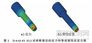 圖2為Ti-6Al-4V ELI試樣斷裂后的應(yīng)力和等效塑性應(yīng)變?cè)茍D。由圖2可知:在試樣受單軸拉伸載荷的過程中,試樣經(jīng)歷了彈性變形階段、塑性變形階段和頸縮過程,直至斷裂。有限元拉伸模型獲得的Ti-6Al-4V ELI鈦合金名義應(yīng)力-名義應(yīng)變曲線如圖3所示,有限元仿真結(jié)果與準(zhǔn)靜態(tài)棒料拉伸試驗(yàn)結(jié)果吻合良好,證明了有限元建模中使用材料的參數(shù)具有較好的準(zhǔn)確性。