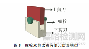使用有限元分析軟件對(duì)螺栓雙剪試驗(yàn)過程進(jìn)行仿真分析,結(jié)果如圖5所示,幾何模型按雙剪試驗(yàn)標(biāo)準(zhǔn)中雙剪試驗(yàn)裝置相關(guān)參數(shù)建立。由圖5可知:模型整體由3個(gè)部分組成,分別為受載的上剪刀、固定在基座內(nèi)的下剪刀以及螺栓。
