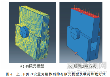 針對(duì)邊界條件的設(shè)置,由于下剪刀始終固定在基座中,因此在有限元模型中將下剪刀底面完全固定。同時(shí),為了模擬螺栓雙剪試驗(yàn)過程中的真實(shí)加載過程,減輕材料應(yīng)變率對(duì)仿真結(jié)果的影響程度,在設(shè)置邊界條件時(shí),沒有對(duì)上剪刀施加位移載荷,而是施加了壓力載荷,且壓力載荷的加載速率為666.7N/s。