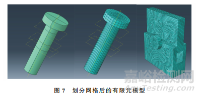網(wǎng)格單元的質(zhì)量對(duì)仿真結(jié)果至關(guān)重要。在建模過程中,使用掃掠技術(shù),結(jié)合六面體單元對(duì)螺栓進(jìn)行網(wǎng)格劃分,網(wǎng)格類型為C3D8R。為了提高仿真結(jié)果的準(zhǔn)確性,將螺栓劃分為多個(gè)區(qū)域,并對(duì)螺栓受剪區(qū)域的網(wǎng)格進(jìn)行了細(xì)化,劃分網(wǎng)格后的有限元模型如圖7所示。