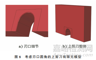 在實(shí)際制造過程中,剪刀刃口的形狀為圓弧狀,圓弧曲率半徑即為刃口半徑。刃口直接參與剪切過程,刃口半徑對(duì)螺栓雙剪試驗(yàn)結(jié)果會(huì)造成影響。在上剪刀刃口處對(duì)模型建立圓角(見圖8),考慮不同刃口半徑對(duì)螺栓雙剪試驗(yàn)結(jié)果的影響。