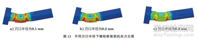 不同刃口半徑下螺栓斷裂前的應(yīng)力云圖如圖13所示。由圖13可知:當(dāng)刃口半徑為0.3mm時(shí),螺栓斷裂前的應(yīng)力水平最低,螺栓沿上剪刀運(yùn)動(dòng)方向的位移較小,最大應(yīng)力集中在剪切區(qū)域;當(dāng)刃口半徑為0.1mm時(shí),螺栓斷裂前的應(yīng)力傳播較為均勻。