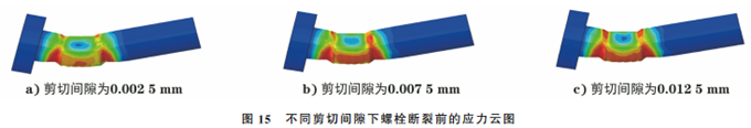 不同剪切間隙下螺栓斷裂前的應(yīng)力云圖如圖15所示。由圖15可知:不同剪切間隙下螺栓斷裂前的最大應(yīng)力水平十分接近,當(dāng)剪切間隙為0.0125mm時(shí),螺栓受剪切作用發(fā)生變形的區(qū)域較大,且與上剪刀接觸部分的螺栓軸向長(zhǎng)度較??;隨著剪切間隙的增大,單個(gè)螺栓截面的剪力逐漸增加。