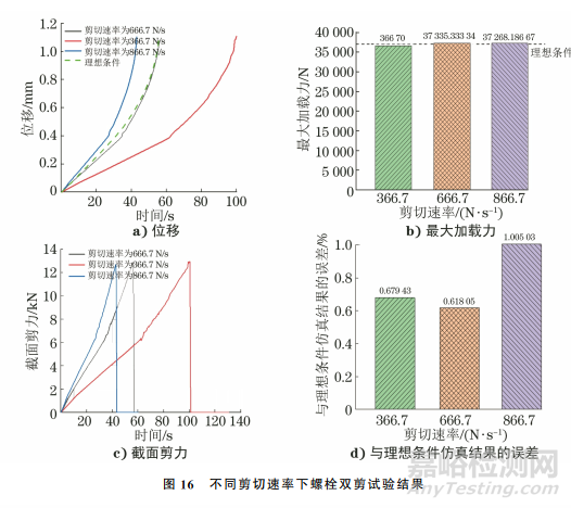 不同剪切速率下螺栓雙剪試驗(yàn)結(jié)果如圖16所示。由圖16可知:剪切速率對(duì)試驗(yàn)結(jié)果的影響較小,3種剪切速率下仿真結(jié)果與理想條件仿真結(jié)果較為接近;當(dāng)剪切速率為866.7N/s時(shí),仿真結(jié)果與理想條件仿真結(jié)果的誤差僅為1%。表明在螺栓雙剪試驗(yàn)過程中,剪切速率對(duì)試驗(yàn)結(jié)果影響不大。