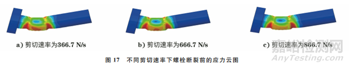 不同剪切速率下螺栓斷裂前的應(yīng)力云圖如圖17所示。由圖17可知:不同剪切速率下螺栓斷裂前的最大應(yīng)力水平十分接近,螺栓的應(yīng)力分布水平也比較接近。剪切速率未對(duì)螺栓雙剪試驗(yàn)的有限元仿真結(jié)果造成明顯的影響。