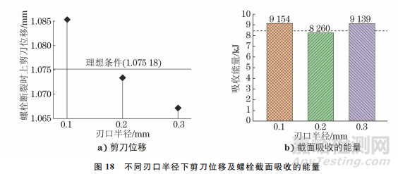 不同刃口半徑下剪刀位移及螺栓截面吸收的能量如圖18所示。由圖18可知:當(dāng)刃口半徑為0.1,0.3mm時(shí),螺栓截面在斷裂前吸收的能量較高,能量吸收能力分別增加了8.85%和8.67%;當(dāng)刃口半徑為0.2mm時(shí),螺栓截面在斷裂前吸收的能量與理想條件仿真結(jié)果相比略有下降。在實(shí)際螺栓雙剪試驗(yàn)過程中,應(yīng)對(duì)剪切裝置的刃口半徑進(jìn)行合理控制。