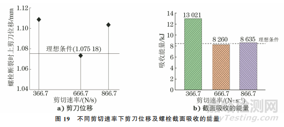 不同剪切速率下剪刀位移及螺栓截面吸收的能量如圖19所示。由圖19可 知:當(dāng)剪切速率為666.7,866.7N/s時(shí),螺栓截面在斷裂前吸收的能量比較接近,與理想條件仿真結(jié)果有差距;當(dāng)剪切速率為366.7N/s時(shí),螺栓截面在斷裂前吸收的能量比理想條件 仿真結(jié)果高。說明在螺栓雙剪試驗(yàn)過程中,應(yīng)按試驗(yàn)標(biāo)準(zhǔn)規(guī)定的剪切速率進(jìn)行試驗(yàn)。