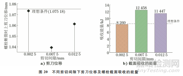 不同剪切間隙下剪刀位移及螺栓截面吸收的能量如圖20所示。由圖20可知:當(dāng)剪切間隙為0.0025mm時(shí),螺栓的能量吸收能力與理想條件仿真結(jié)果較為接近;當(dāng)剪切間隙為 0.0075mm時(shí),螺栓的能量吸收能力提高了48.13%。因此,應(yīng)合理控制剪切間隙,以降低試驗(yàn)結(jié)果的誤差。