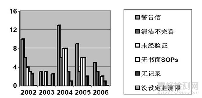 設(shè)備清潔是一個(gè)非常重要的內(nèi)容,有很多公司都忽視了法律法規(guī)中對(duì)設(shè)備清潔的要求,曾經(jīng)收到過(guò)“警告信”。圖 1 中列出了從 2002 年到 2006 年 5 年間發(fā)生的 483 缺陷的統(tǒng)計(jì)情況。值得注意的是,將近 95% 的“警告信”都是因企業(yè)沒有制訂出有效防止?jié)撛诮徊嫖廴镜脑O(shè)備清潔程序而產(chǎn)生的。沒有定期對(duì)設(shè)備和器具進(jìn)行清潔與維護(hù),有可能造成交叉污染,并對(duì)藥品的安全性、鑒別特性、濃度/效價(jià)、質(zhì)量和純度造成影響,違反聯(lián)邦法規(guī) 21 第 211.67a。