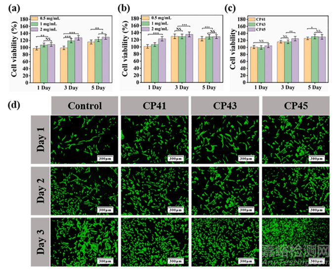 將不同濃度的水凝膠預(yù)聚物(0.5、1、2mg/ml)與水凝膠與細胞直接接觸培養(yǎng),細胞存活率均在98%以上,說明PLMA的引入對細胞無明顯副作用。