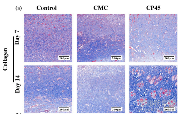 以市售Tegaderm™膜為對照組,采用Masson染色法評價各組的膠原沉積情況,試驗結(jié)果表明,相較于其他組,含有PLMA的CP水凝膠組在14天膠原蛋白水平明顯提高,且排列有序。