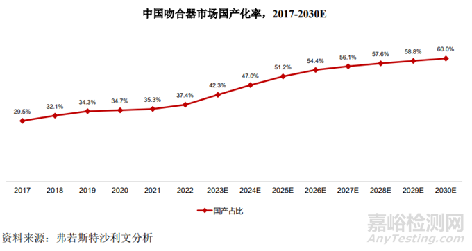 近年來,中國(guó)政府出臺(tái)一系列政策不斷支持國(guó)產(chǎn)醫(yī)療器械產(chǎn)業(yè)發(fā)展,國(guó)家?guī)Я坎少徴吖膭?lì)企業(yè)更多地使用國(guó)產(chǎn)醫(yī)療器械,進(jìn)口替代趨勢(shì)明顯,為科技創(chuàng)新型的國(guó)產(chǎn)醫(yī)療器械廠商注入了政策紅利。在吻合器行業(yè),隨著國(guó)內(nèi)企業(yè)在技術(shù)上的不斷突破,國(guó)產(chǎn)手動(dòng)腔鏡吻合器已經(jīng)逐步達(dá)到與進(jìn)口品牌相當(dāng)?shù)募夹g(shù)水平,而國(guó)產(chǎn)電動(dòng)腔鏡吻合器也已經(jīng)能夠與進(jìn)口品牌共同競(jìng)爭(zhēng),國(guó)產(chǎn)化趨勢(shì)逐步顯現(xiàn)。隨著國(guó)家政策的不斷推進(jìn)及國(guó)產(chǎn)吻合 器廠商技術(shù)的持續(xù)創(chuàng)新,國(guó)產(chǎn)吻合器市場(chǎng)規(guī)模不斷擴(kuò)大,國(guó)產(chǎn)廠商的市場(chǎng)份額預(yù)計(jì)將進(jìn) 一步提升。根據(jù)弗若斯特沙利文分析,2017 年中國(guó)吻合器國(guó)產(chǎn)化率為 29.5%,2022 年中國(guó)吻合器國(guó)產(chǎn)化率為 37.4%;預(yù)計(jì)到 2030 年,中國(guó)吻合器國(guó)產(chǎn)化率上升至 60.0%,吻合器國(guó)產(chǎn)化進(jìn)程在 2023 年至 2030 年將不斷持續(xù)。