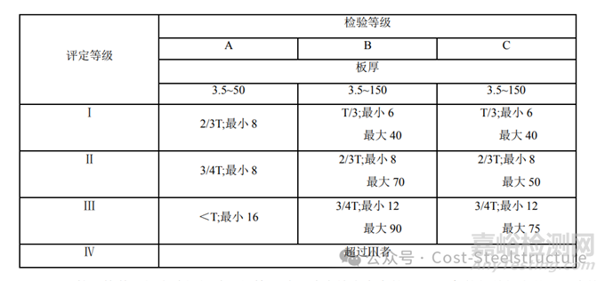 一級焊縫評定合格等級應(yīng)為《鋼熔化焊對接接頭射線照相和質(zhì)量分級》GB/T 3323 的Ⅱ級及Ⅱ級以上,二級焊縫評定合格等級應(yīng)為《鋼熔化焊對接接頭射線照相和質(zhì)量分級》GB/T3323的III級及III級以上。