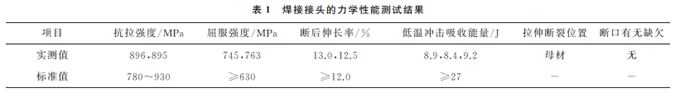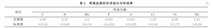 在焊接接頭的垂直于焊縫處取樣,對(duì)試樣進(jìn)行化學(xué)成分分析,結(jié)果如表2所示,可見焊縫金屬的化學(xué)成分滿足焊材產(chǎn)品標(biāo)準(zhǔn)對(duì)熔敷金屬的要求。