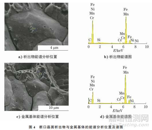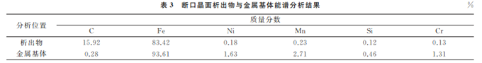 對(duì)斷口晶面上的較大顆粒析出物和準(zhǔn)解理區(qū)域的金屬基體進(jìn)行能譜分析,結(jié)果如圖4和表3所示。由圖4和表3可知:析出物主要含有 Fe、C 等元素,其中C元素質(zhì)量分?jǐn)?shù)為15.92%,F(xiàn)e元素質(zhì)量分?jǐn)?shù)為83.42%,Si、Mn、Cr、Ni等元素含量較少;金屬基體的C元素含量遠(yuǎn)低于析出物,Si、Mn、Cr、Ni等元素含量均高于析出物,可以推斷析出物主要為Fe3C。