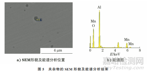 將斷口處焊縫金屬磨拋后,觀察夾雜物的SEM形貌,并對(duì)夾雜物進(jìn)行能譜分析,結(jié)果如圖5所示。由圖5可知:夾雜物呈球狀,主要含有O、Al、Mn等元素,夾雜物為球狀A(yù)l、Mn氧化物。