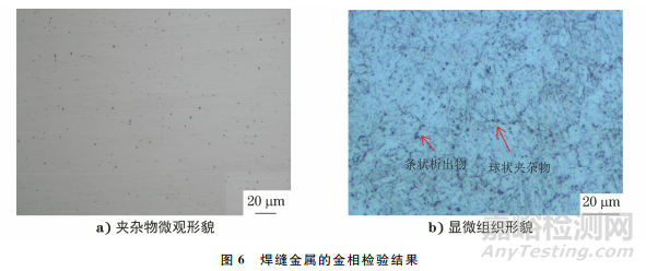 對(duì)焊縫金屬拋光面進(jìn)行金相檢驗(yàn),結(jié)果如圖6所示。由圖6可知:焊縫金屬中含有大量球狀?yuàn)A雜物;焊縫金屬顯微組織為回火索氏體,晶界清晰,可觀察到條狀析出物和球狀?yuàn)A雜物沿晶界分布。