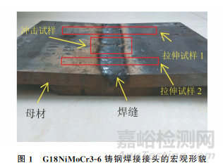 G18NiMoCr3-6低合金高強(qiáng)度鑄鋼經(jīng)調(diào)質(zhì)處理后具有較高的強(qiáng)度、良好的塑性和韌性,可用于生產(chǎn)軌道交通中的關(guān)鍵零部件。但合金鋼的砂型鑄造易受鑄件尺寸、壁厚、原材料、氣候、操作方法等因素的制約,鑄件經(jīng)常出現(xiàn)縮松、砂眼、氣孔、夾雜等鑄造缺陷。對(duì)于鑄件表面較大的缺陷,在熱處理前可對(duì)其進(jìn)行補(bǔ)焊。為了嚴(yán)格控制G18NiMoCr3-6鋼缺陷的補(bǔ)焊質(zhì)量,必須進(jìn)行焊接工藝評(píng)定,以驗(yàn)證焊接及焊后熱處理工藝的正確性。某單位制備了焊評(píng)試驗(yàn)用焊接接頭,其母材材料為 G18NiMoCr3-6鑄鋼,焊材選用CHE857CrNi低合金高強(qiáng)鋼焊條,采用焊條電弧焊焊接,焊后接頭的宏觀形貌如圖1所示。對(duì)焊后接頭整體進(jìn)行調(diào)質(zhì)熱處理,其工藝為:900℃,3h,油冷+560℃,3h,油冷。在對(duì)焊接接頭進(jìn)行力學(xué)性能測(cè)試過程中,發(fā)現(xiàn)試樣的低溫(-40℃)沖擊性能不合格。研究人員采用一系列理化檢驗(yàn)方法查明了G18NiMoCr3-6鑄鋼焊接接頭低溫沖擊性能不合格的原因,以避免該類問題再次發(fā)生。