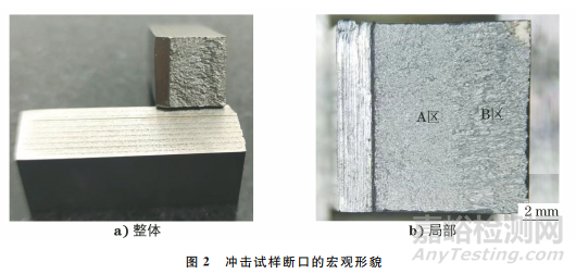 沖擊試樣斷口的宏觀形貌如圖2所示。由圖2可知:斷口齊平,呈銀白色結(jié)晶狀,可見放射狀條紋,無纖維區(qū)和剪切唇,僅存在放射區(qū),為宏觀脆性斷裂;斷口A區(qū)放射紋較細(xì)膩,B區(qū)放射紋粗糙。試樣在擺錘沖擊力的作用下,缺口側(cè)(A區(qū))受拉應(yīng)力,不開口側(cè)(B區(qū))受壓應(yīng)力,當(dāng)裂紋進(jìn)入壓應(yīng)力區(qū)時(shí),壓縮變形對(duì)裂紋起到了阻滯作用,使裂紋擴(kuò)展速率變慢。