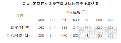 采用相同材料、相同焊接工藝制備回火試驗(yàn)用接頭,接頭整體經(jīng)900℃淬火后,垂直于焊縫將其切割成7塊,用不同溫度回火,保溫3h,油冷。分別對(duì)不同回火溫度下的焊縫金屬及母材的沖擊性能和布氏硬度進(jìn)行測(cè)試,結(jié)果如圖7所示。由圖7可知:在640~660℃回火溫度下,焊縫金屬及母材的沖擊吸收能量不小于27J;在同一回火溫度下,母材的硬度均低于焊 縫 金 屬。為保證焊接接頭的強(qiáng)度滿足要求,將母材硬度近似換算成抗拉強(qiáng)度,結(jié)果如表4所示,可見在600~650℃回火溫度下,母材的抗拉強(qiáng)度滿足標(biāo)準(zhǔn)要求。