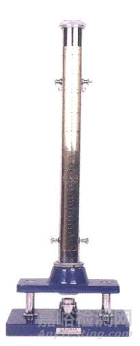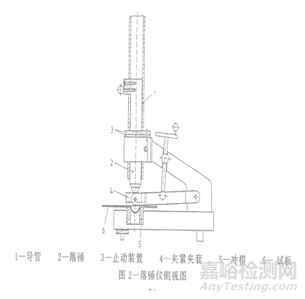 國家標準GB/T 1732的沖擊試驗器,其沖頭上的鋼球直徑為8mm,沖入深度為2mm,重錘質(zhì)量為1Kg,該三項條件都是固定不變的,可調(diào)節(jié)的只是下落高度,而國際標準ISO 6272第一部分落錘試驗(大面積沖頭),除了其沖頭直徑為20mm是固定不變的以外,重錘質(zhì)量、下落高度和沖入深度三個方面都是可以調(diào)節(jié)的,見圖2。首先為了增加試驗的強度,除了主重錘1Kg外,還配置有副錘,可增加副錘至最高 4kg。其次沖擊器的導管上配有止動裝置,有不同的厚度,可用于控制重錘的沖入深度。目前我國國家標準GB/T 20624-2006色漆和清漆快速變形(耐沖擊性)試驗均等同采用國際標準ISO 6272:2002《色漆和清漆 快速變形(耐沖擊性)試驗》。