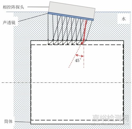 為實(shí)現(xiàn)儲氫鋼瓶快速高靈敏度超聲檢測,提出了帶凹面聲透鏡的相控陣檢測水浸聚焦技術(shù)。筒體軸向缺陷檢測技術(shù)原理示意如圖3所示。