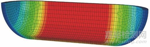 采用有限元模擬仿真技術(shù)對鋼瓶公稱壓力下的應(yīng)力狀態(tài)進(jìn)行分析,獲得了鋼瓶的應(yīng)力云圖,如圖2所示,可知鋼瓶封頭頂部區(qū)域應(yīng)力水平很低,應(yīng)力較大區(qū)域?yàn)橥搀w和封頭靠近筒體段,因此,該鋼瓶檢測重點(diǎn)區(qū)域?yàn)橥搀w和封頭靠近筒體段。