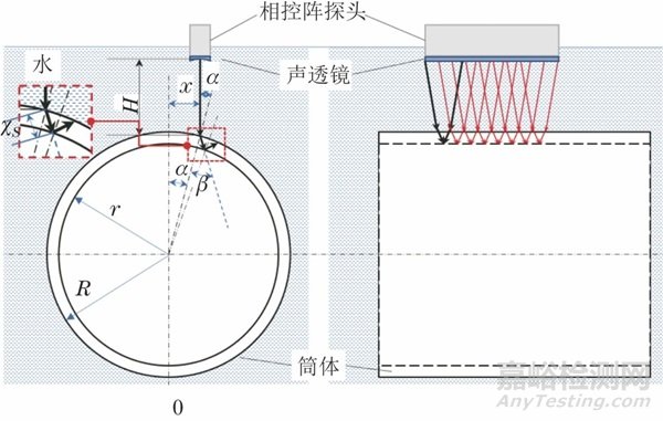 檢測時將相控陣超聲探頭置于水中,陣列沿軸向布置,通過調(diào)節(jié)偏心距x使水/鋼界面入射角α大于第一臨界角,從而使入射聲束在鋼瓶中產(chǎn)生純橫波,且橫波折射角β應(yīng)確保橫波折射中心線觸及鋼瓶內(nèi)壁,因此偏心距x應(yīng)滿足: