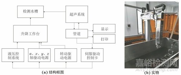 基于上述的CIVA仿真分析,開發(fā)了一套針對復(fù)雜曲面構(gòu)件的五軸聯(lián)動相控陣超聲水浸C掃描自動檢測系統(tǒng),其結(jié)構(gòu)框圖和實(shí)物如圖7所示。