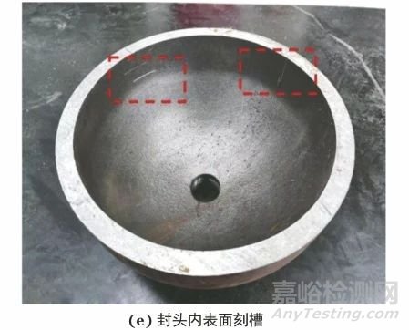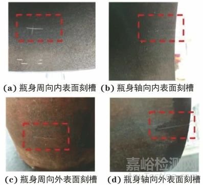 為驗(yàn)證帶凹面聲透鏡的相控陣技術(shù)對鋼瓶軸向缺陷的檢測可靠性,將儲氫鋼瓶切割后在瓶身以及封頭部分各加工了4種不同位置的人工刻槽缺陷,其位置分別處于周向外表面、周向內(nèi)表面、軸向外表面、軸向內(nèi)表面。其中內(nèi)外表面缺陷被錯開、間隔為90°,以提高檢測和識別的準(zhǔn)確性。